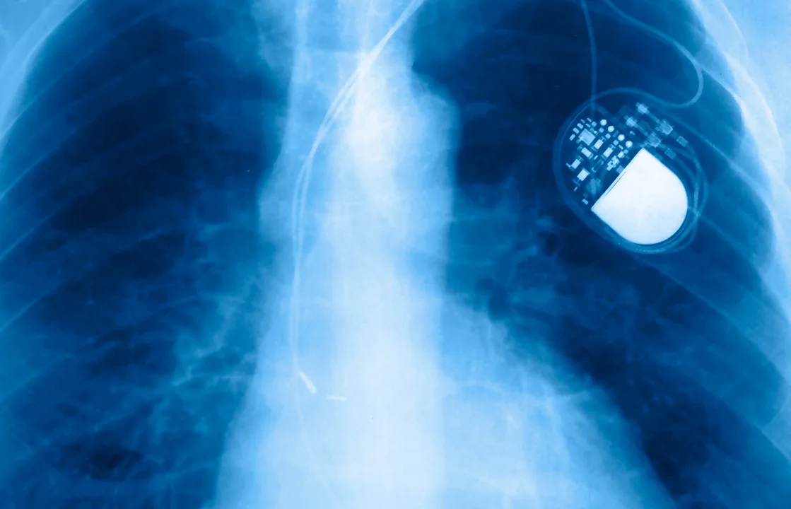 Radiografía del torso de una persona, donde se visualiza lo que es un marcapasos que se le ha colocado.