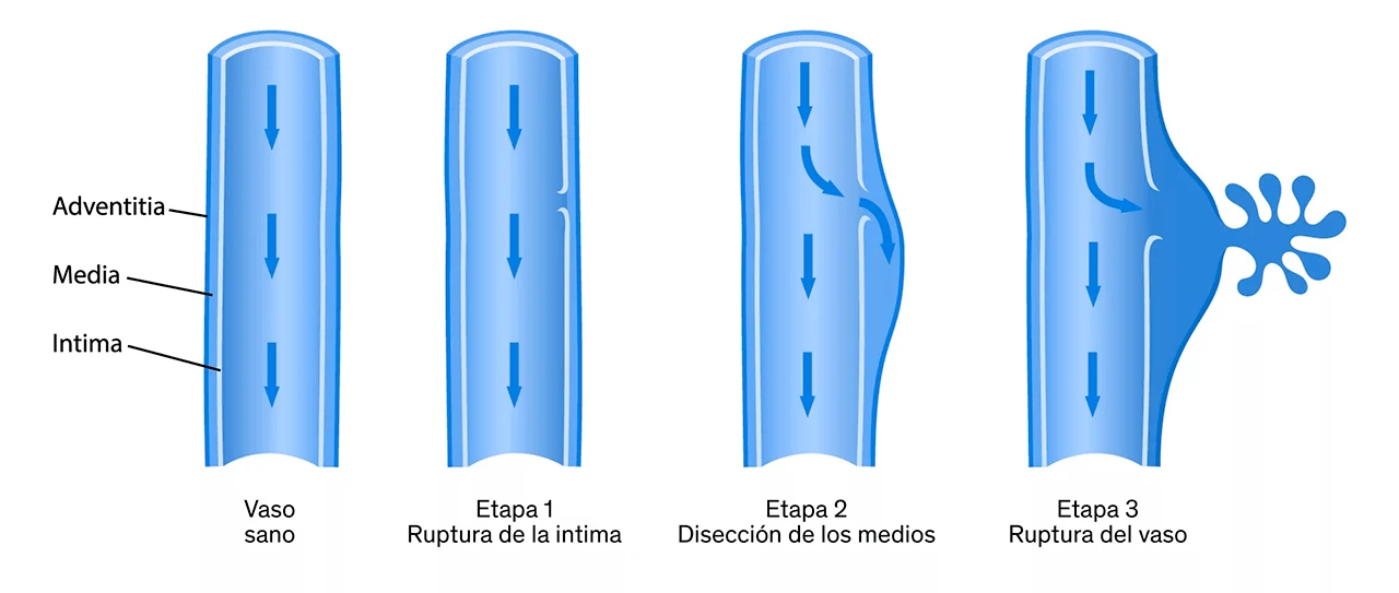 Por otro lado, una disección aórtica puede causar una ruptura de este vaso que puede llevar a un sangrado que pone en peligro la vida.