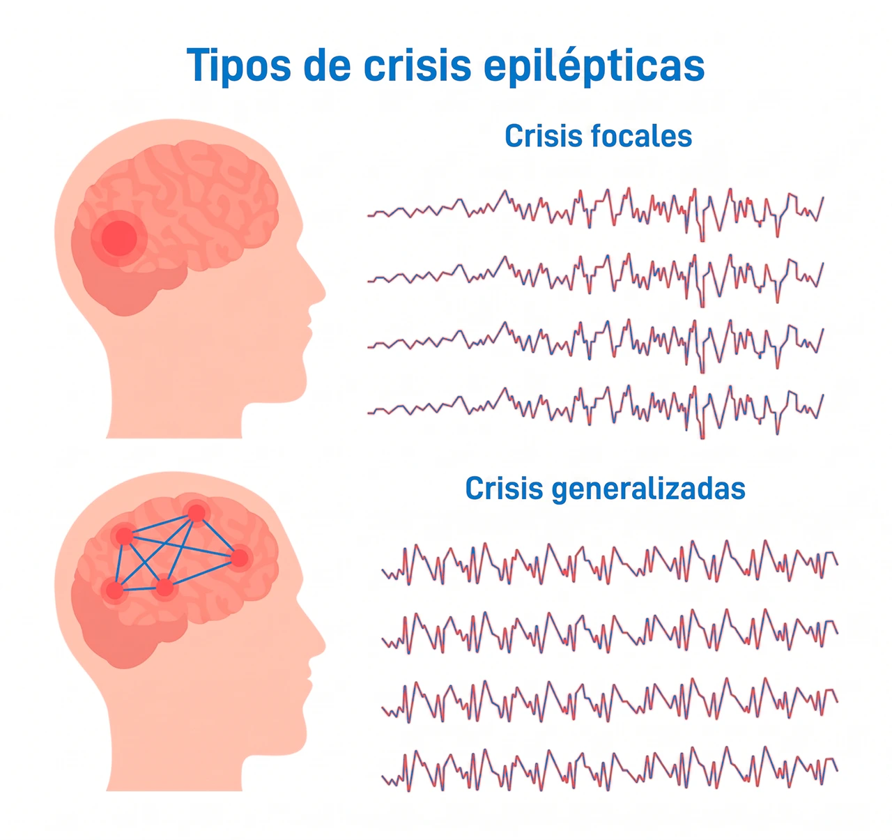 En este tipo, la actividad eléctrica anormal afecta a ambos lados del cerebro simultáneamente. Los ejemplos más conocidos son las crisis de ausencia, comunes en niños, donde el menor parece «quedarse en blanco» por segundos y las crisis tónico-clónicas. Estas últimas son las que la sociedad identifica más fácilmente, involucrando rigidez muscular seguida de sacudidas rítmicas de las extremidades.